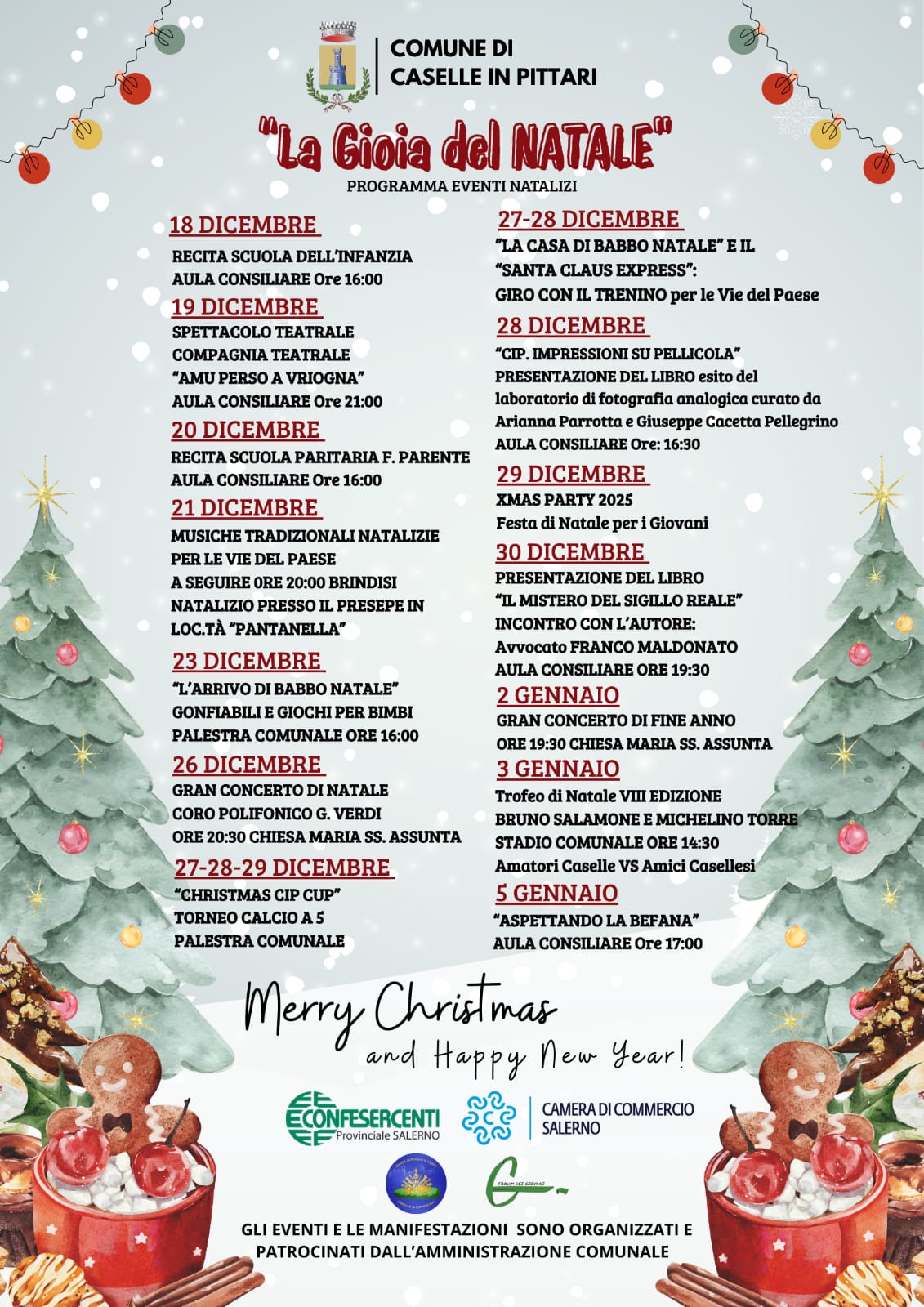 Il sindaco e il consiglio comunale di Caselle in Pittari augurano serene festività natalizie e felice prospero anno nuovo. Pubblicato il programma delle iniziative natalizie organizzate con il sostegno della Camera di Commercio di Salerno