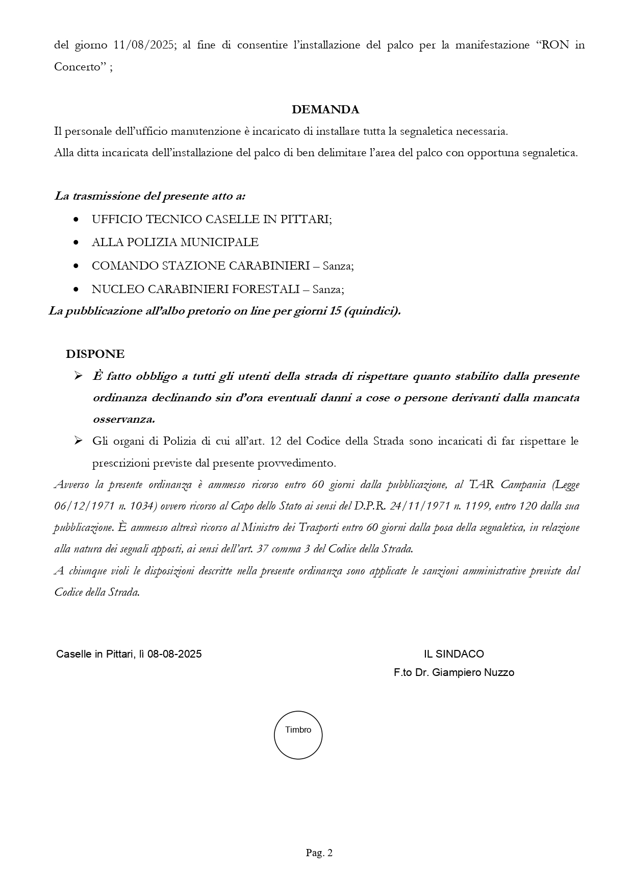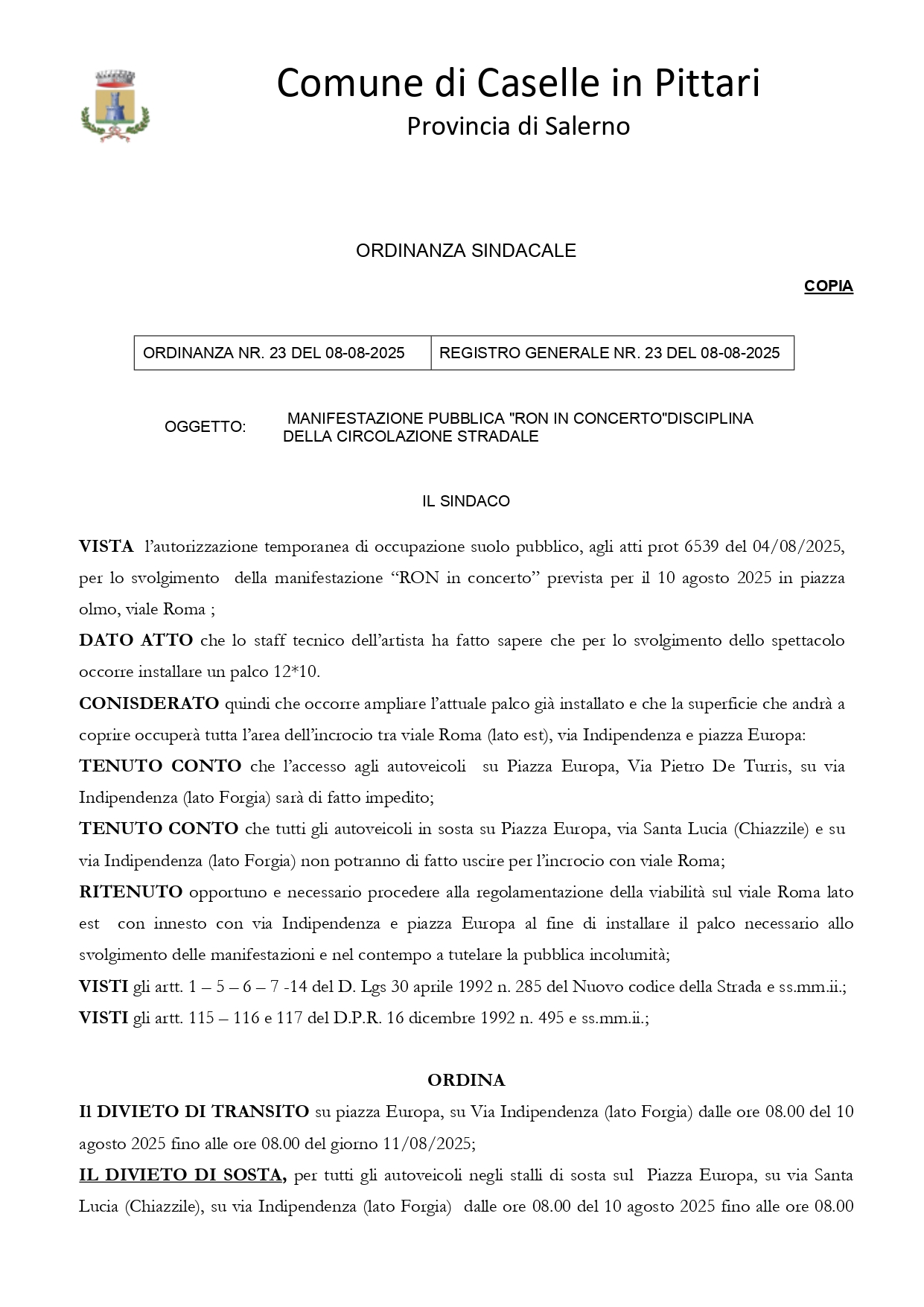 In occasione del concerto pubblico dell'artista Ron, con ordinanza sindacale n. 23/2025, vengono istituiti divieti di transito e di sosta, per consentire l'ampliamento del palco in viale roma.